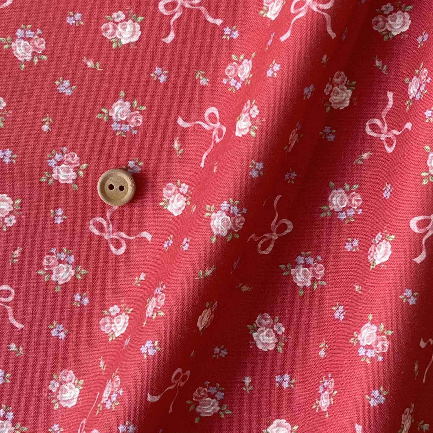可憐なバラの間にリボンが散りばめられたキュートでロマンティックなプリントです。
